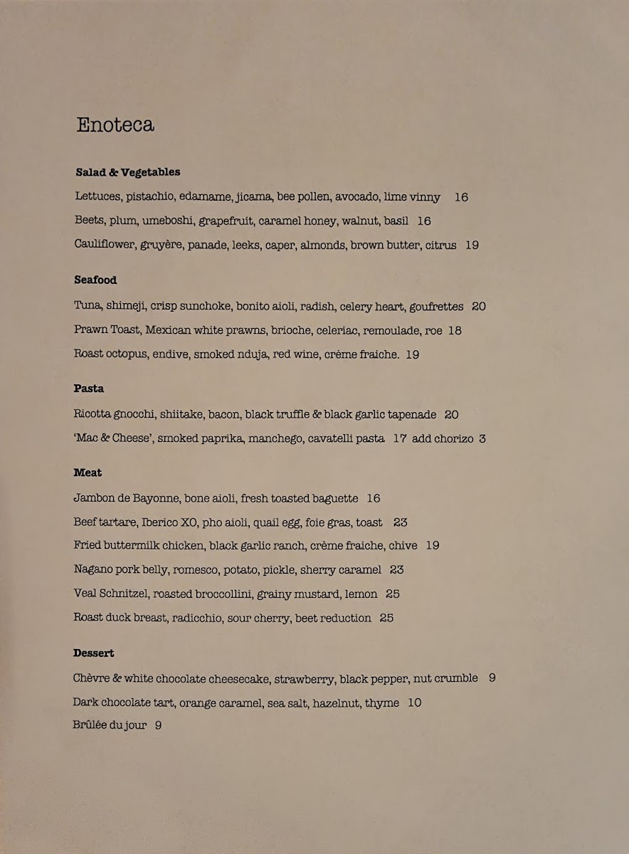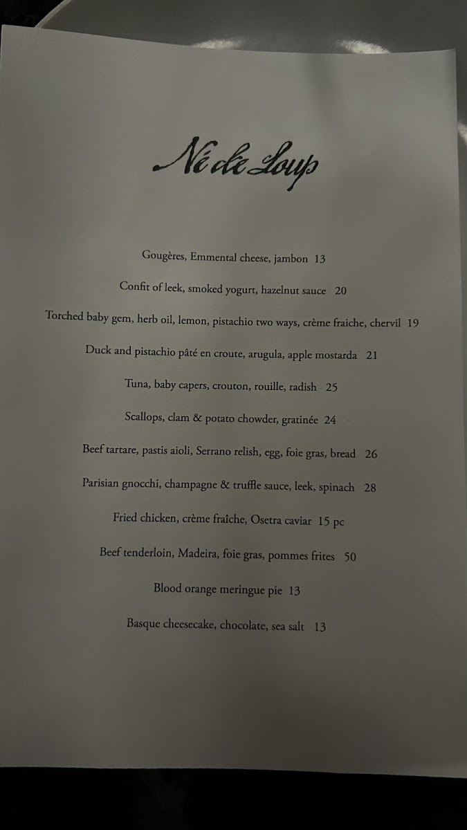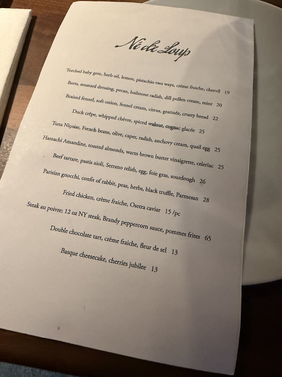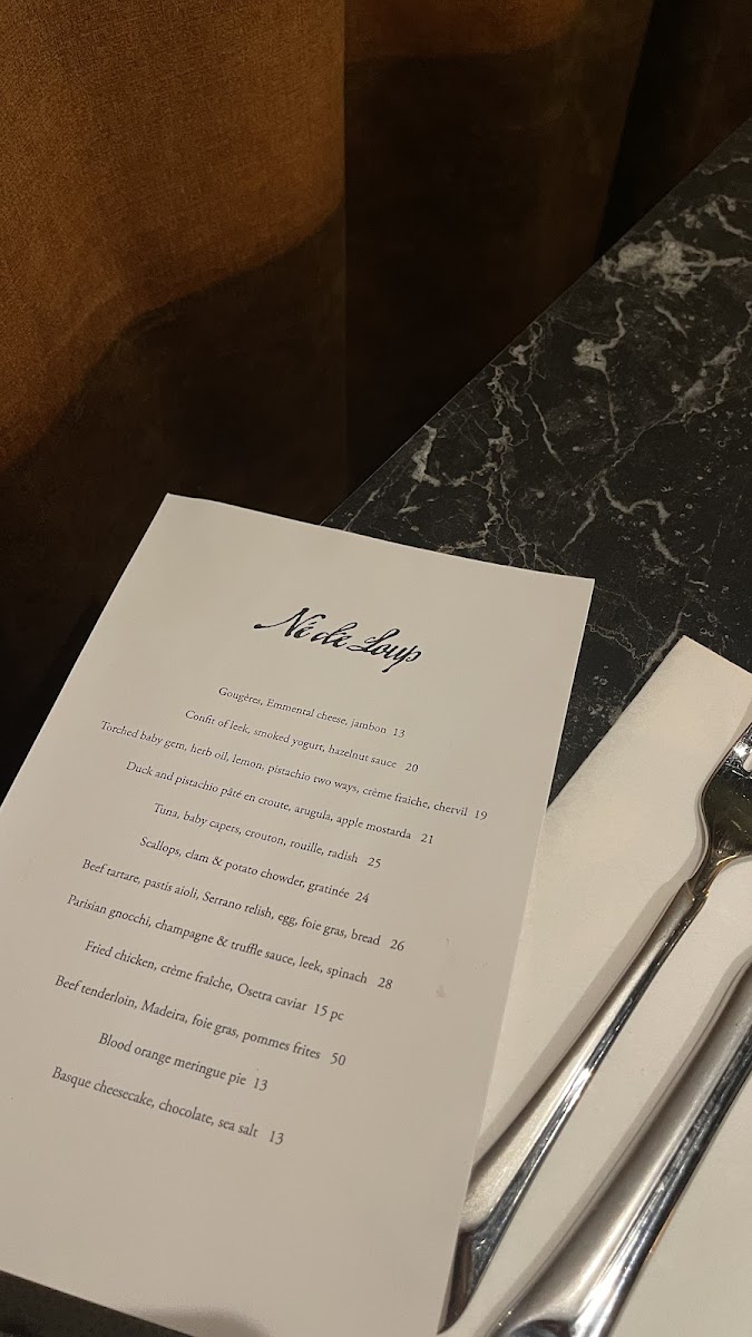 Complemented by a simple yet warm setting, the menu items reflect the style of the space: understated but with a clear focus on quality and balance. Desserts like a passion fruit tart or chèvre cheesecake provide a light but satisfying finish, fitting naturally into a thoughtful, measured dining experience. Overall, the menu embodies an approachable way to experience elevated dishes that are both comforting and intriguing.
