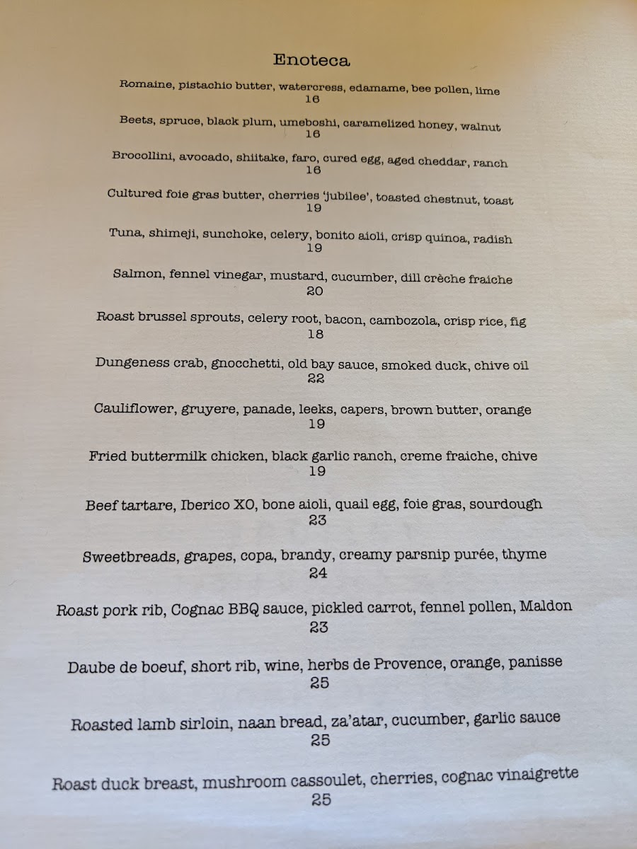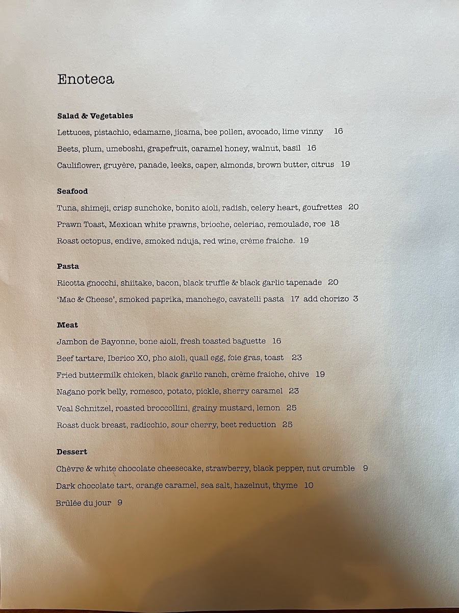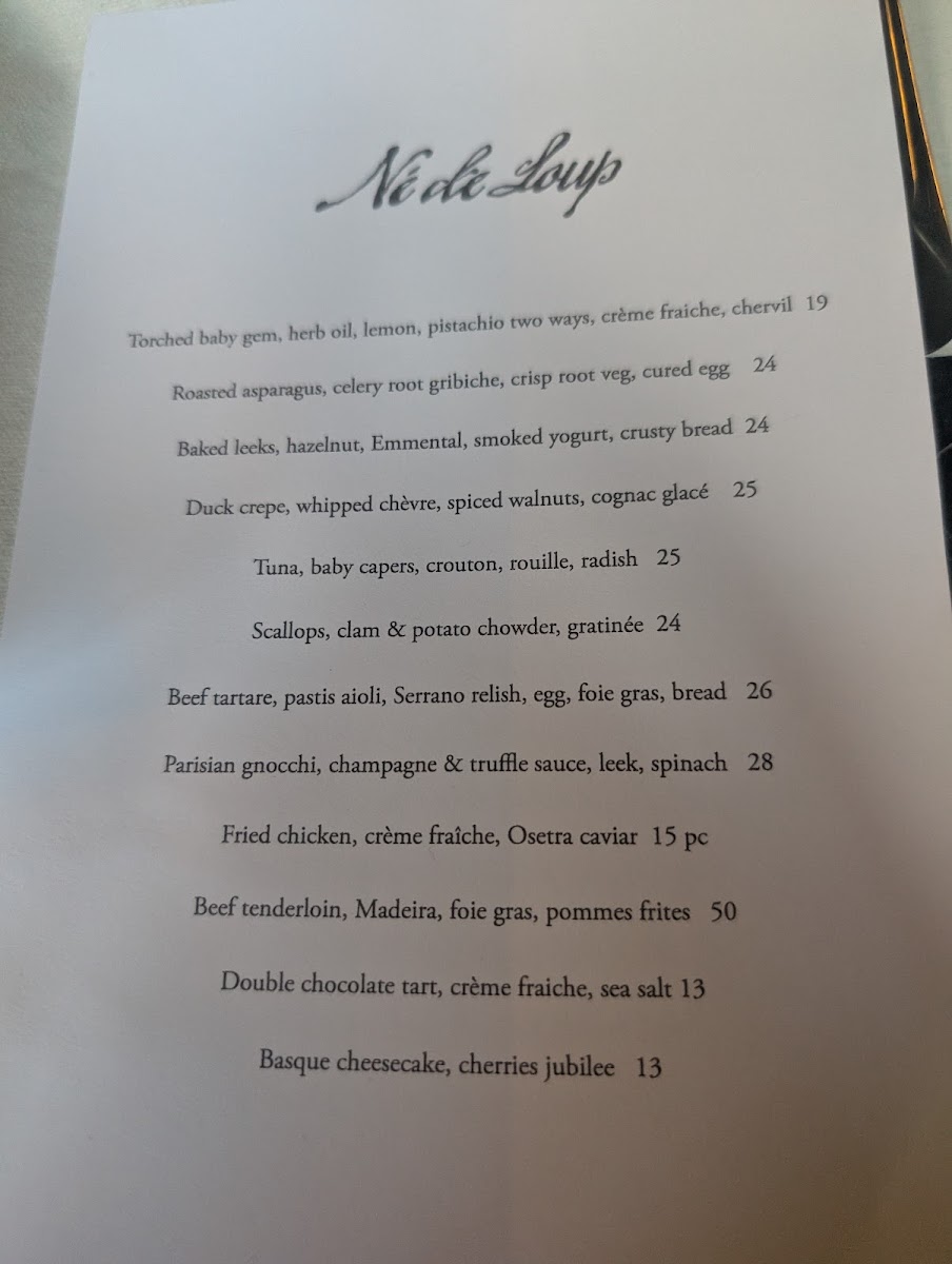 Complemented by a simple yet warm setting, the menu items reflect the style of the space: understated but with a clear focus on quality and balance. Desserts like a passion fruit tart or chèvre cheesecake provide a light but satisfying finish, fitting naturally into a thoughtful, measured dining experience. Overall, the menu embodies an approachable way to experience elevated dishes that are both comforting and intriguing.